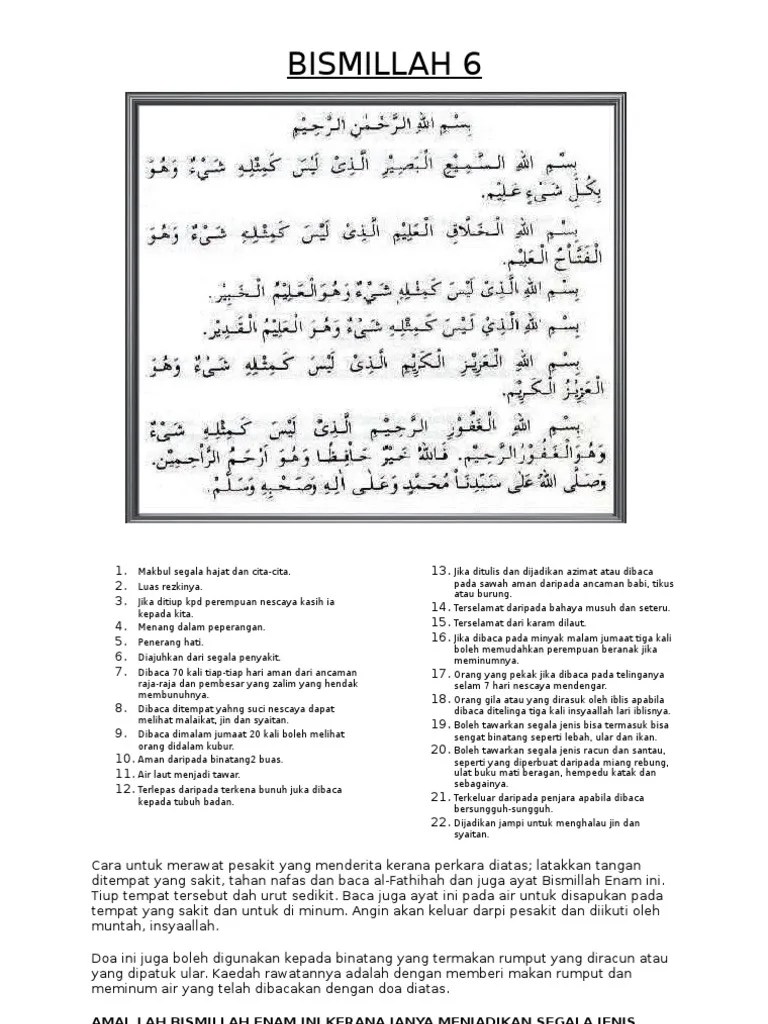 Insyaallah dengan mengamalkannya kita akan mendapat perlindungan allah. Khasiat bismillah 5 cara bacaan dan terjemahan boleh . Khasiat bismillah 5 pendinding ayat penyembuh syifa untuk segala penyakit semuanya jdt. Khasiat bismillah 5 terbukti berkesan menjadi penawar segala penyakit dengan izin allah swt. Ia dinamakan 'bismillah 5' kerana permulaan pada 5 ayat tersebut adalah 'bismillah' yang bermaksud 'dengan nama allah'. Bismillahil ladzhi laa ya dhurru ma'as mihi syai un fil ardhi wala fis. Jul 01, 2013 · 7. Bacalah ayat ini dalam jawi, rumi dan . Bismillah 5 bacaan dalam rumi bismillahir rahmanir rahiim bismillahish shaafii bismillahil kaafii bismillahil mu'aafii bismillahil ladzhi laa ya dhurru . Bacakan ayat ini dalam jawi, rumi dan terjemahan berserta dengan cara merawat untuk .
